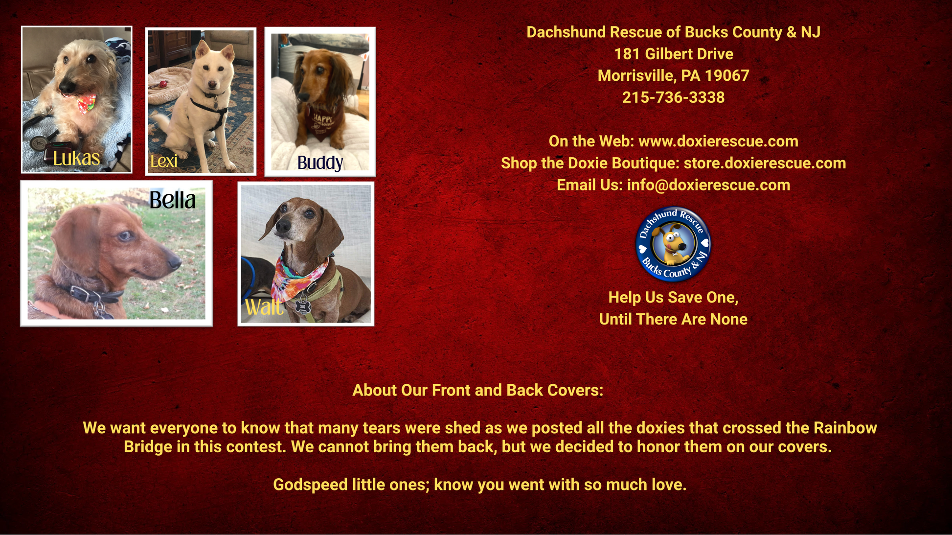 About Our Front and Back Covers: We want everyone to know that many tears were shed as we posted all of the doxies that crossed the Rainbow Bridge. We cannot bring them back, but we made a decision to honor them on our covers. Godspeed to each and every one; the outpouring of support for your families let us know you went with lots of love.