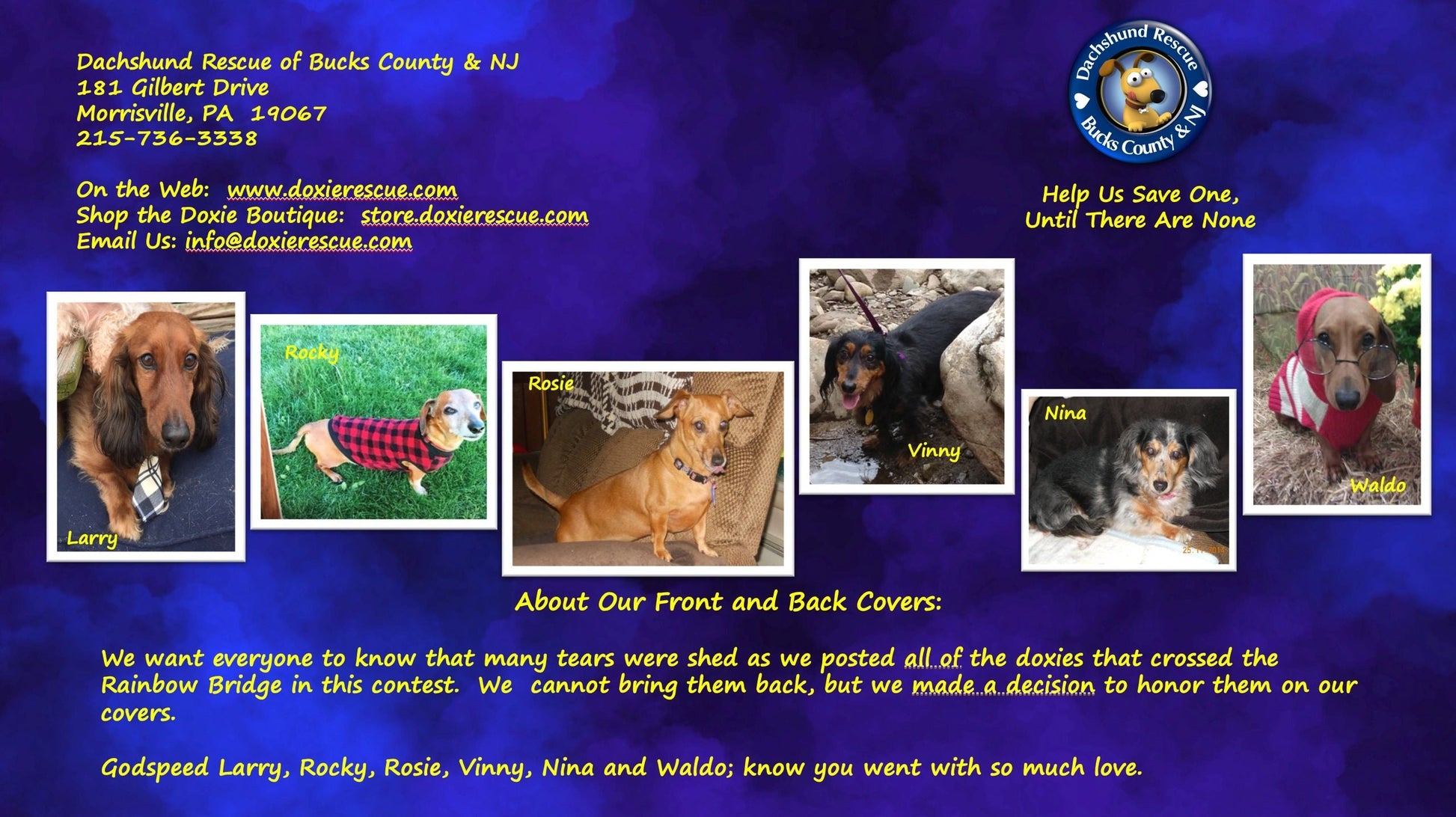 About Our Front and Back Covers: We want everyone to know that many tears were shed as we posted all of the doxies that crossed the Rainbow Bridge. We cannot bring them back, but we made a decision to honor them on our covers. Godspeed to each and every one; the outpouring of support for your families let us know you went with lots of love.