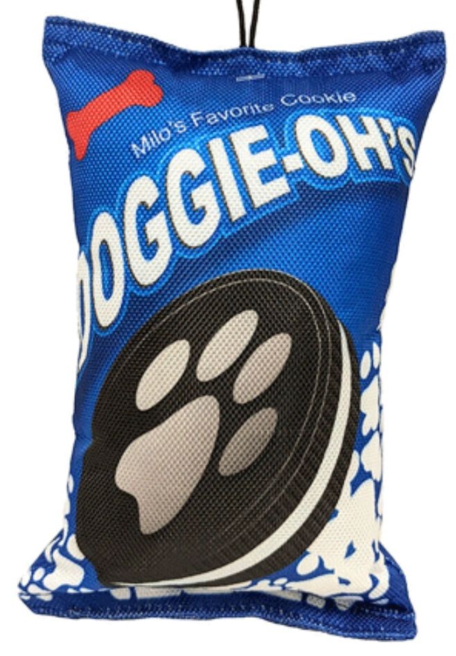 Fun Foods "Doggie Ohs" is a parody toy of popular Oreo cookies. Made of durable ballistic nylon with crinkle paper inside that sounds like a real bag of cookies! Also includes a squeaker for even more fun. 0 calories, 100% fun for your pup!Share