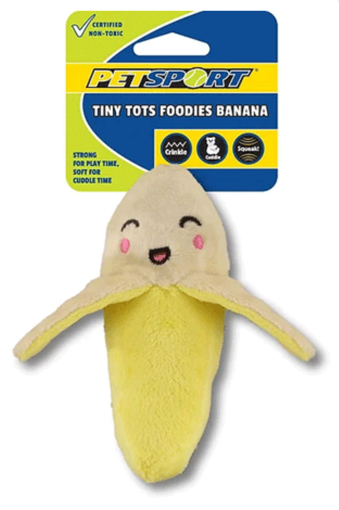 Tiny Tots Foodies Banana is a durable, but super soft dog toy made for small dogs. Foodies Banana is the best cure for a bored pet that loves to play, like puppies or even seniors who act like a puppy.