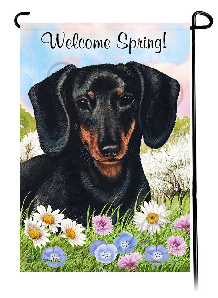 This Dachshund Longhair Black Welcome Spring Garden Flag is great for when the weather turns warmer! The flag measures 17 3/4" long and 12" wide. It features the artwork of renowned artist Tamara Burnett. You can personalize the flag with your pet's name, or you can just have the breed. They are proudly decorated in the USA !!!! ** Stand is not included **