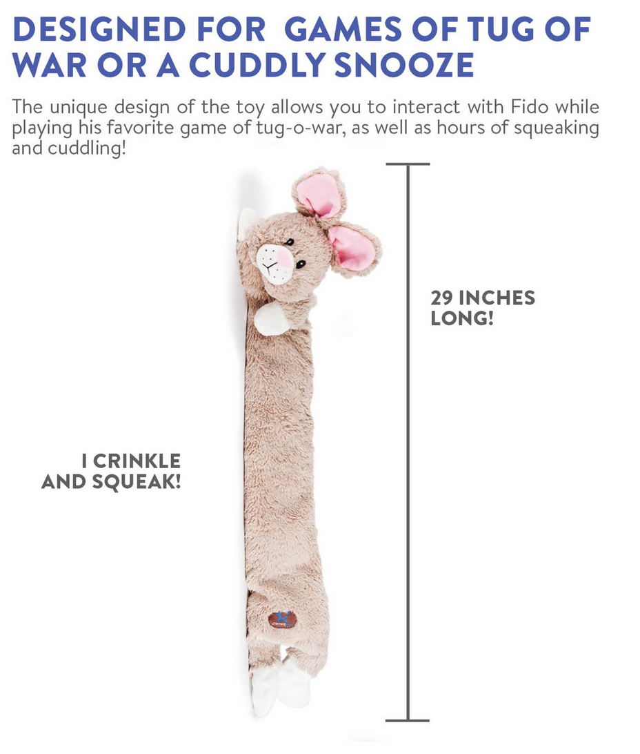 - SOFT & SQUEAKY DOG TUG TOY: The Longidudes by Charming Pet are a floppy friend your pup is sure to adore. Packed with 3 large squeakers and crinkle material for a stimulating and fun experience your pup will love!